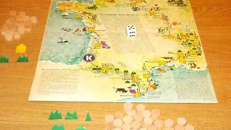 This Dutch cycling game from 1965 was enclosed in the Dutch weekly magazine, called Revue. The gameboard, which is made from glossy magazine paper, has a 'board' of 38 x 35 cm. The game also contains several tokens, which you had to cut out from the magazine. There is a green and yellow jersey, the polkadot mountain jersey, a tour-caravan token and several 1 to 3 peaked mountain tokens. You need also a die and a number of chips or matches, whatever you like. The paper gameboard has the Tour de France route of 1965 printed on it. At the start, every player gets some chips as starting money. After a stage is finished, the tour caravan pawn moves to the next stage. Every stage has a number printed on, this is important for the dice rolling. You need to roll that number for winning the stage. Since this fame is purely based on dice rolling, the rules are very simple. You can earn or lose chips depending on how the dice rolls. The game ends when the tour caravan reaches the final stage in Paris. The player who has the most chips at this point wins the game.