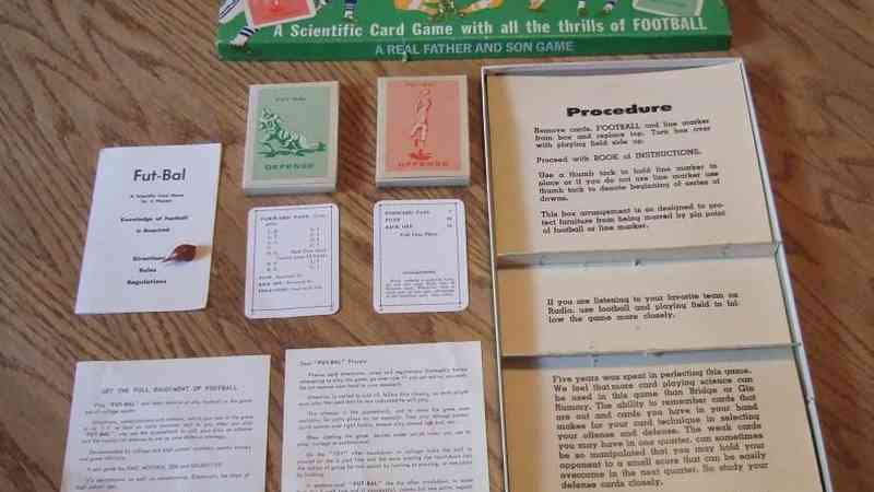 Play FUT-BAL was designed and self-published by Willard H. Wendt, former Ohio University and Depauw University Quarterback. The game uses cards which depict plays to simulate football game. Includes Football field board and metal football, plus both offensive and defensive play cards. The game does not include a board, per se. Rather, the football field is printed on the box bottom. It is expected that you will punch small pilot holes in this box bottom with the included pushpin. The plastic football token for tracking the scrimmage line has a spike that can be wedged into these holes as you advance down the field.