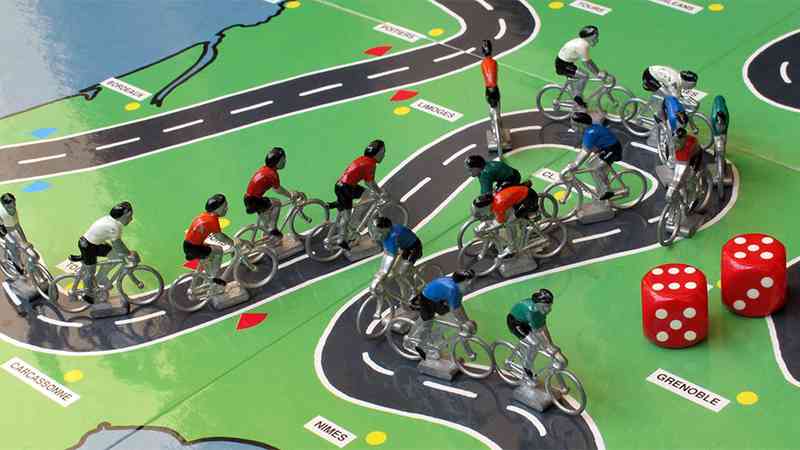 French cycling boardgame that appeared in the '80s or early '90s. The green gameboard has France on it with a road that represents the Tour de France. The game has wonderful metal cyclists that in 4 different colors, each for a player. There also is a cyclist with a yellow jersey to represent the leader and a rider with a blue cap to represent the leader in the Dauphiné Liberé race. The game has roll and move mechanics and it comes with 2 dice.