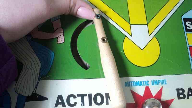 Game consists of metal field with spring-action bat and marble. Wood frame reads "Roger Maris" at top. Maris facsimile signature appears at bottom left. One player "pitches" the ball and the other attempts to hit it. Many holes are located in the outfield and when the ball falls into one of those holes the result of the play is determined.