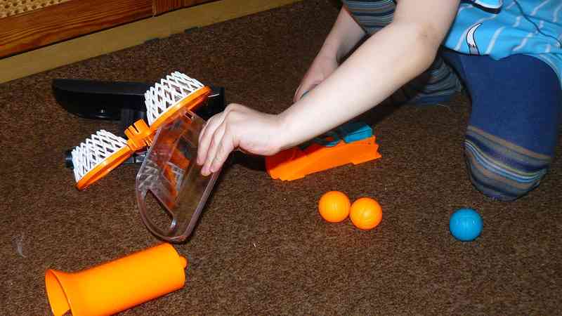 Each player picks a set of colored balls and begin shooting their balls at their basketball net. The first player to get all three of their balls through the net and into the ball tube is the winner.