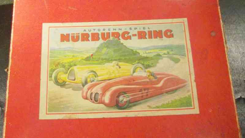 "Autorenn-Spiel Nürburg-Ring" game is basically a roll-and move and go around the track auto-racing type game. Penalties are listed on spaces on the board marked with letters "S", "R", "B" and "T". Players must finish the game by exact count in order to win.