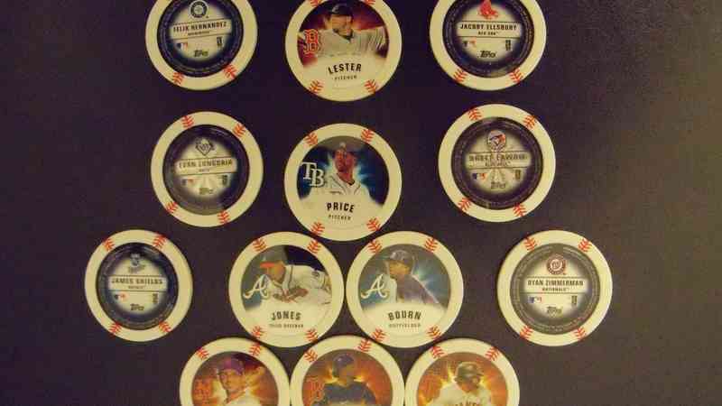 MLB Chipz is a basic dexterity game from Topps using themed, collectible poker chips. The components are themed poker chips with a baseball-inspired design and featuring MLB players. The chips come in several variants such as magnetic, glow-in-the-dark, and metallic but the variants do not affect game play. The game board is reminiscent of a baseball diamond, with scoring zones marked for value. The themed components do not impact game play. Each package contains four random chips, a sticker, and a game board.