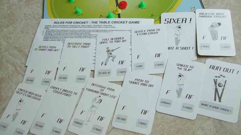 The Table Cricket Game is played (as noted in the rules) "...as per the rules of real one-day limited over cricket." The batsman draws cards from a deck and the fielder places his pawns on the spaces on the board marked by dots, such as "silly point" and "midoff." The batsman then plays his cards one after the other, and tallies his runs. Each card has a type of hit (such as "Full-blooded drive to Mid-on") as well as a F and NF section, showing how many runs would be scored if the fielder has placed a pawn there (F for "fielder") or if there is no fielding pawn there (NF for "no fielder"). Scores are tabulated on the score sheet pads.