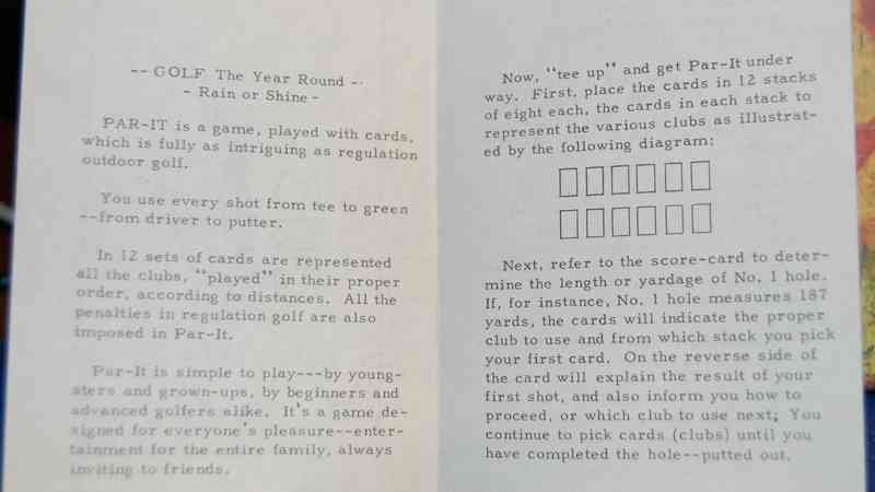 Each copy of the game has a random card affixed to the lid - so some might say No. 3 Iron Mid Mashie while another might say No. 8 Iron Niblic. All the same game - Par It