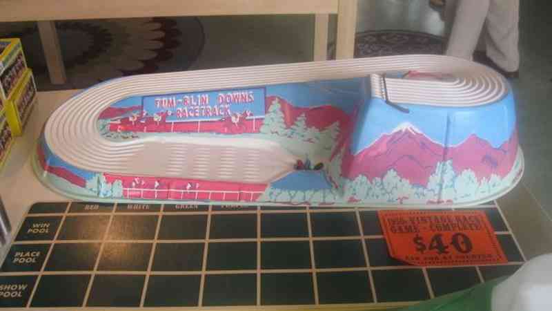 A horse-race game using ball-bearing weighted capsules. When the gate is lifted, eight different "horses" begin tumbling down the track. A betting board allows spectators to bet on win, place and show. The instructions have options for three different types of betting.