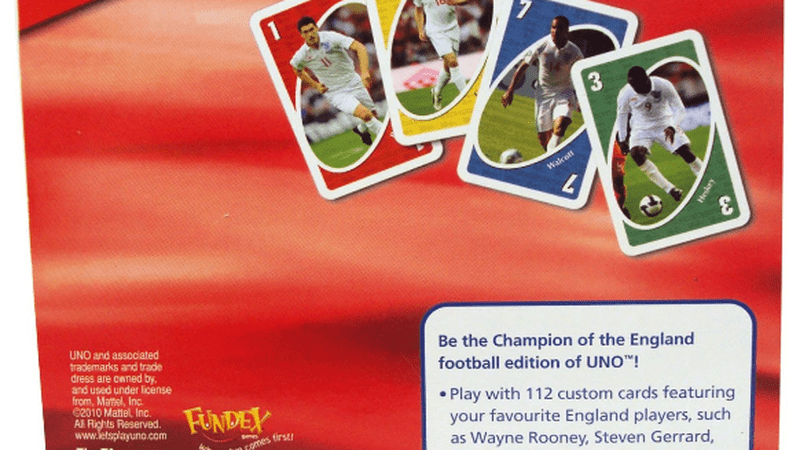 An England Football edition of UNO with 112 custom cards featuring England players. In addition to the normal UNO cards, there is the "Goal" card which allows players to swap a card with another player.