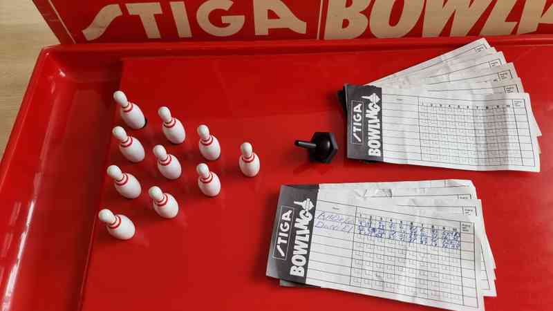 A bowling game where you spin a gyro on a sloping field against the pins