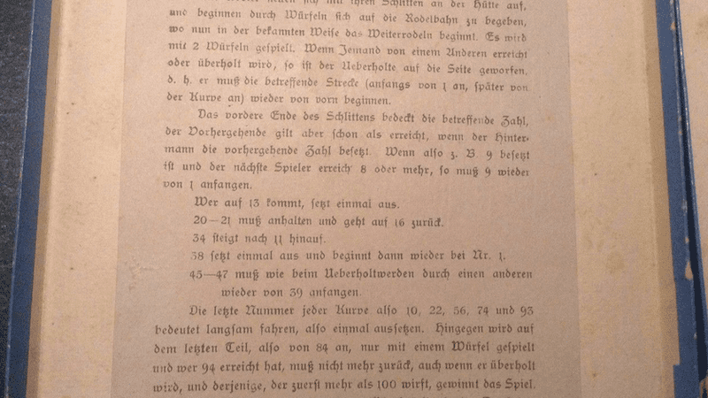 Typical 'Roll & Move' game from the 1910's in Germany. Roll the die by turns and step forward - until you end on a special field - follow instructions glued on lid inside.